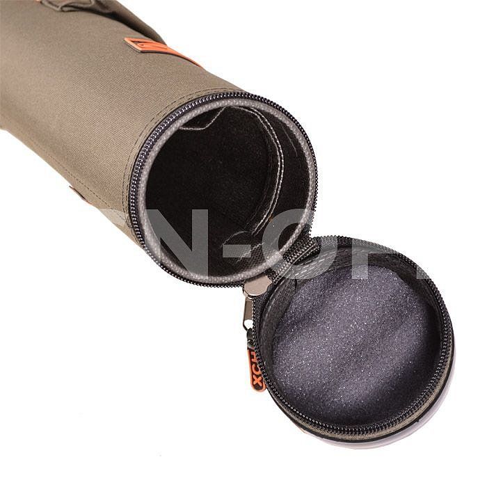 Сделан из пластмассовой трубы, обтянутой тканью Oxford(водостойкая). Внутри и по бокам обклеена ППУ 2 мм. Оба конца закрыты специальными заглушками. В производстве применяют итальянскую фурнитуру, почти не звенящую и не бликующую, а раскрой изделия выполняется на специальном для этого оборудовании, что обеспечивает отличное качество. Для более удобного переноса в конструкции тубуса предусмотрен ремень на плечо и ручка. Есть один большой карман. В тубусе помещается от двух до пяти спиннингов.